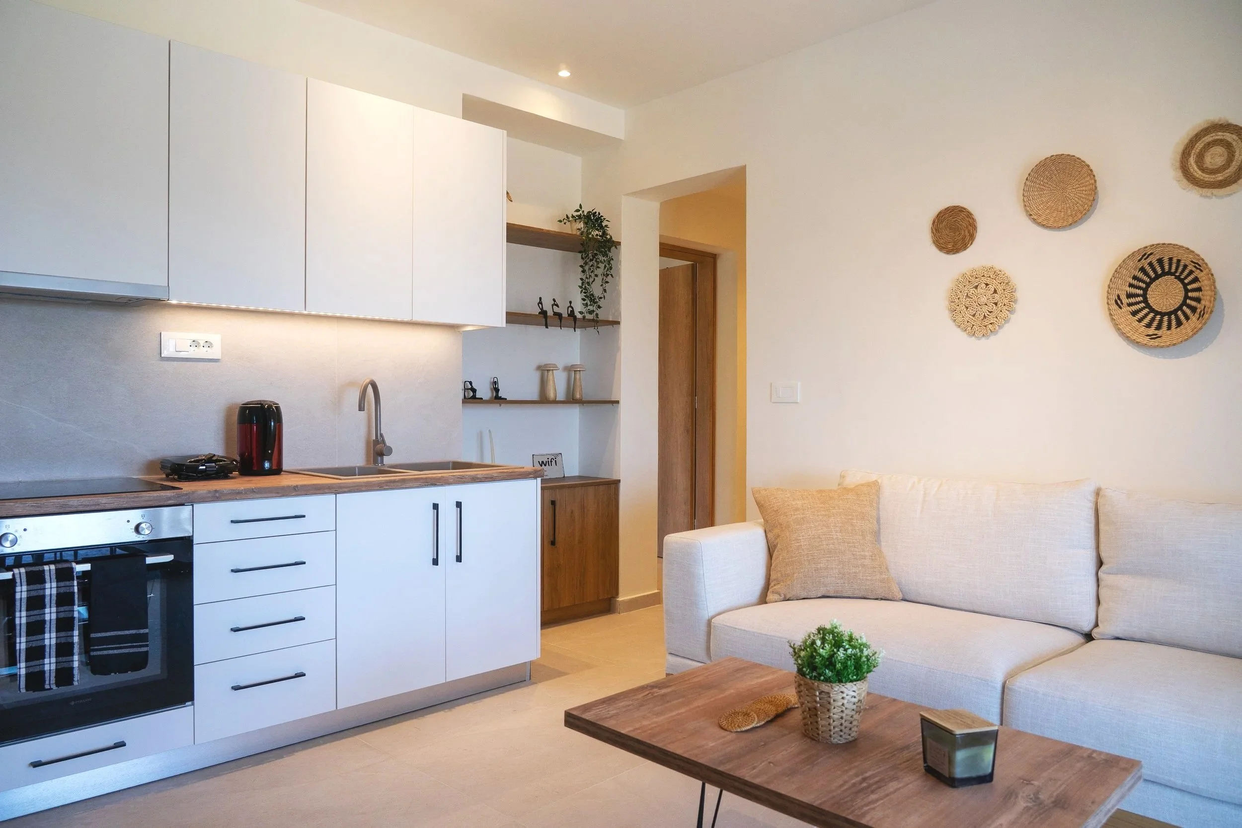 With soft natural tones, a comfortable living area, and a private terrace overlooking the sea and gardens, Aluna Daphne offers a quiet setting for a relaxed stay in Zakynthos.