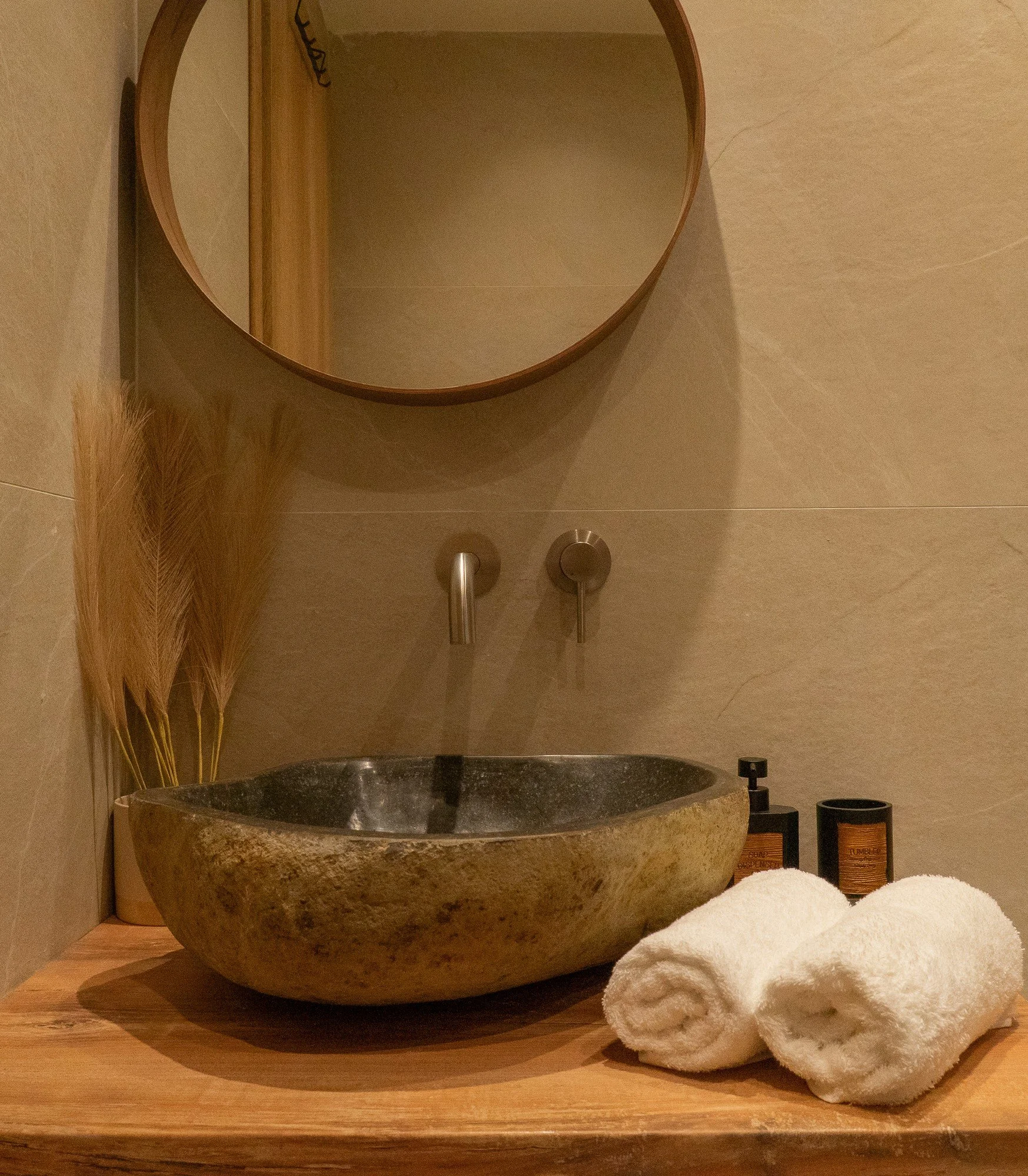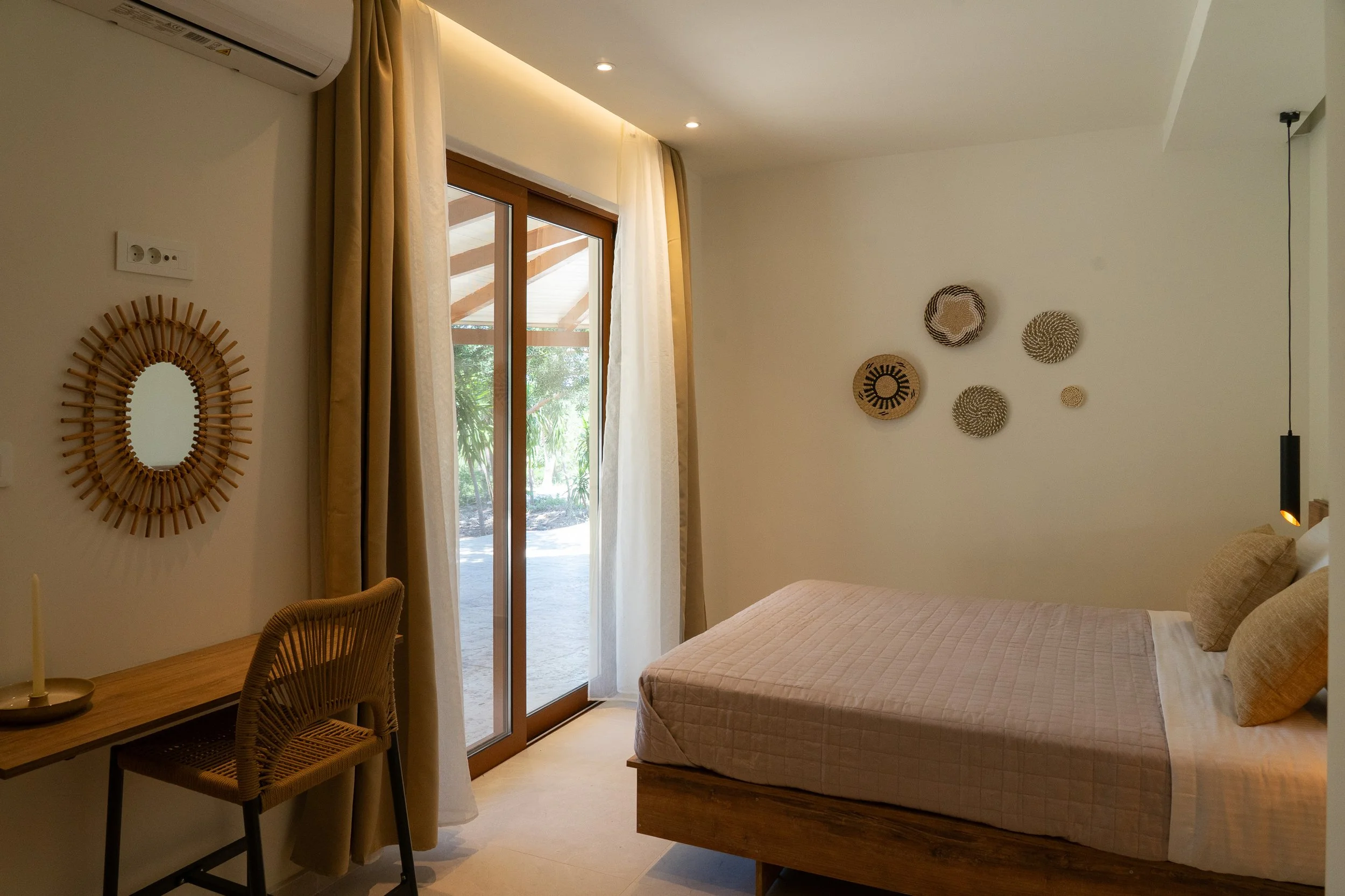 Designed with natural tones, open terraces, and views toward the sea, Aluna blends minimal design with the quiet beauty of the island.