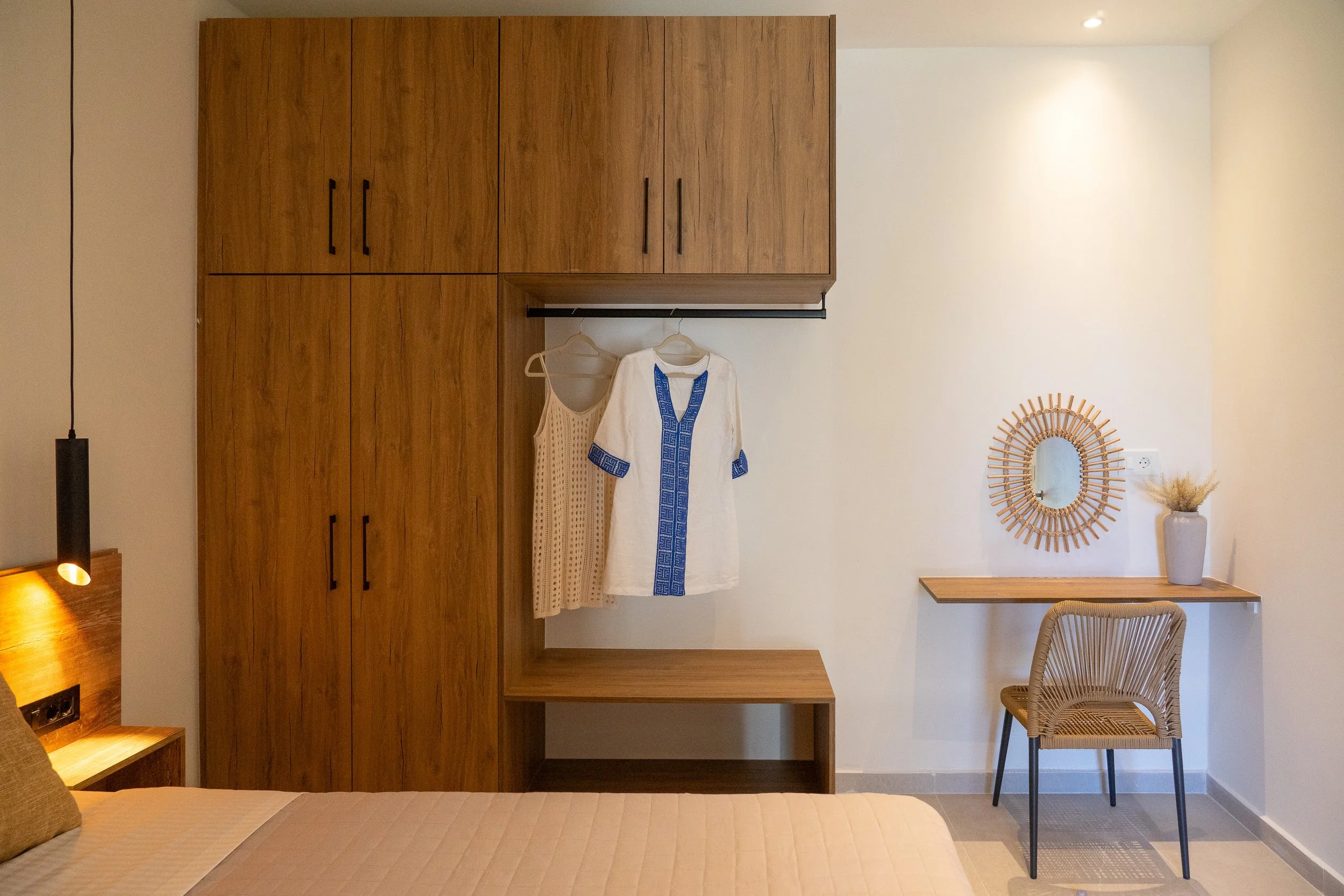 The design of the residences follows the same philosophy. Natural tones, simple textures, and open spaces allow the surrounding landscape to become part of the living experience. Each terrace opens toward the sea and the greenery of the estate, inviting moments of calm from morning to evening.